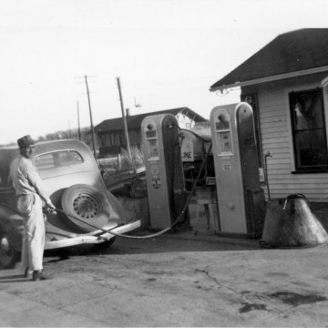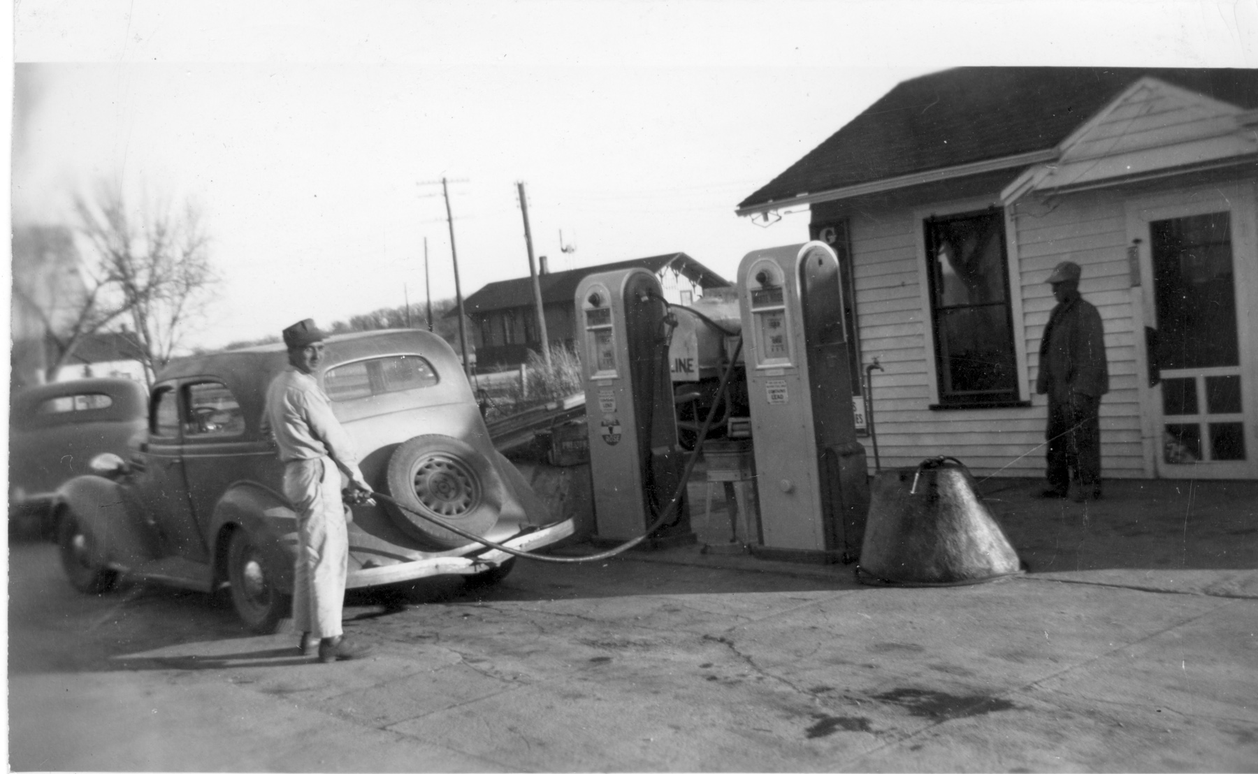 Wabaunsee County native Eddie Meinhardt is seen pumping gas at his first filling station in Paxico, Kansas in this view dated 1956. Meinhardt spent nearly a half a century as a leading businessman in Paxico, operating his gas stations, antique stores and a campground. The Paxico Rock Island depot is visible in the background. Photo courtesy the Eddie Meinhardt family.