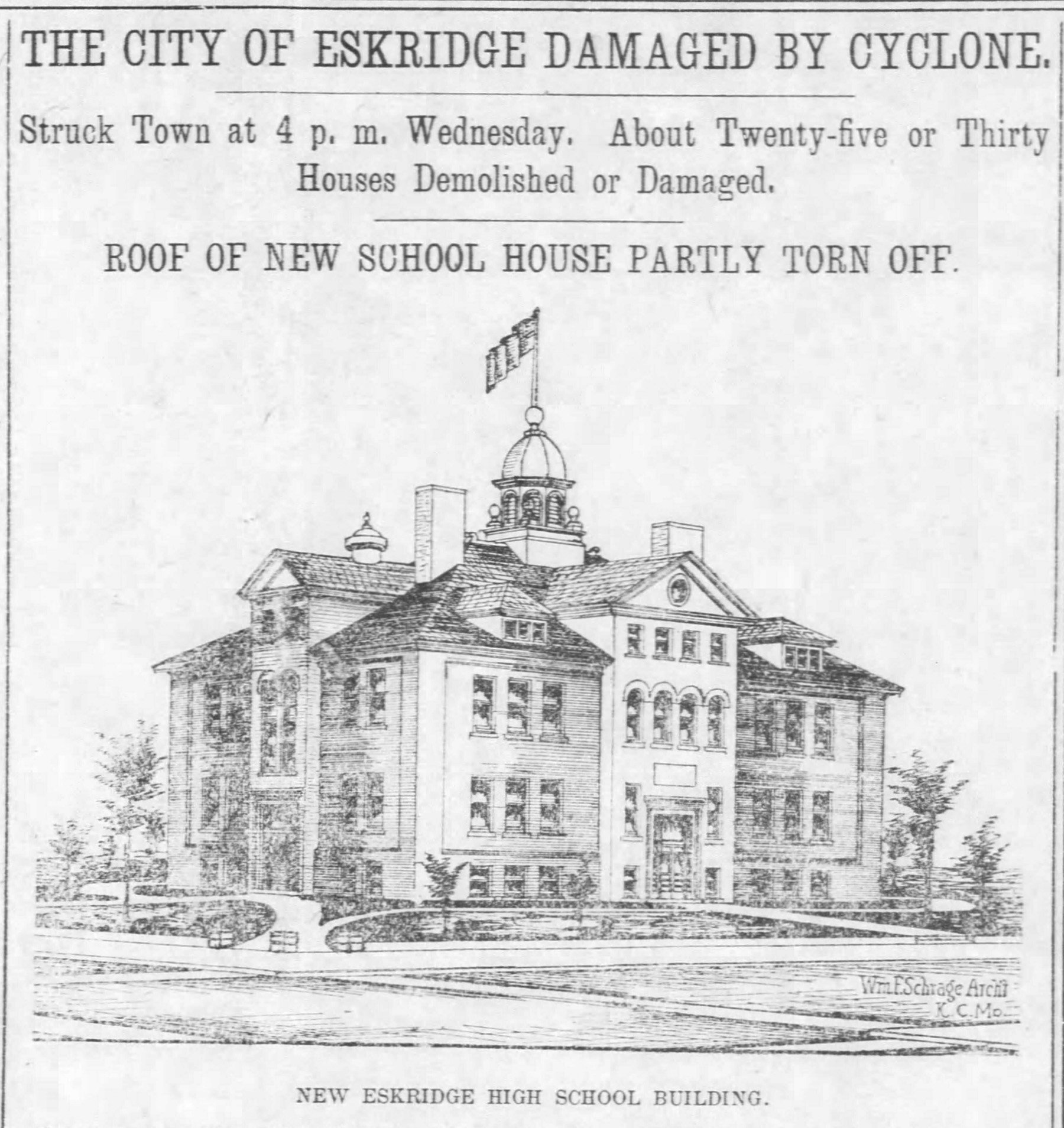 The front page of the April 14, 1911 issue of The Alma Enterprise shows an architect’s drawing of the new Eskridge Public School which was damaged by an April 12th tornado.