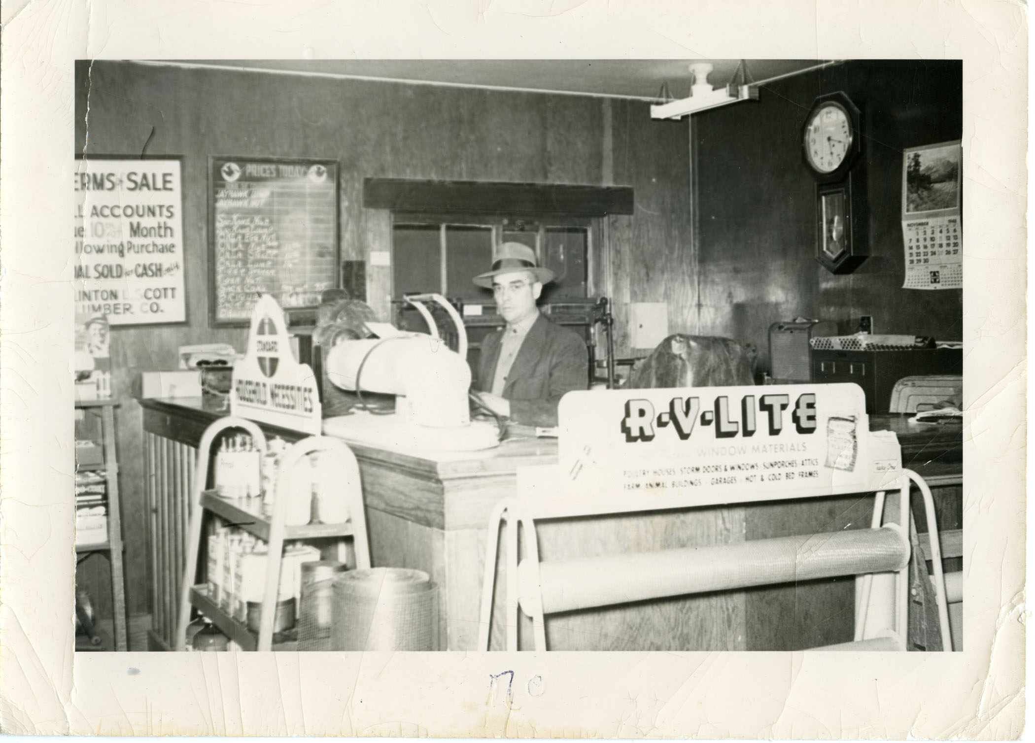 Leland Lucky, manager of the Clinton Scott Lumber Company is seen behind the counter at the lumber company in November of 1943.