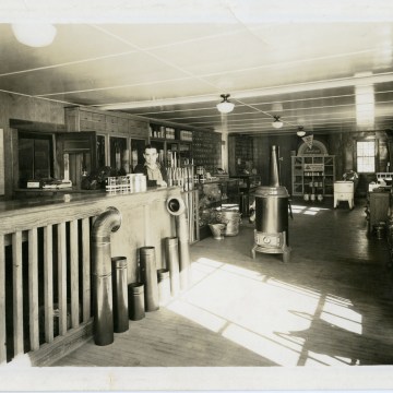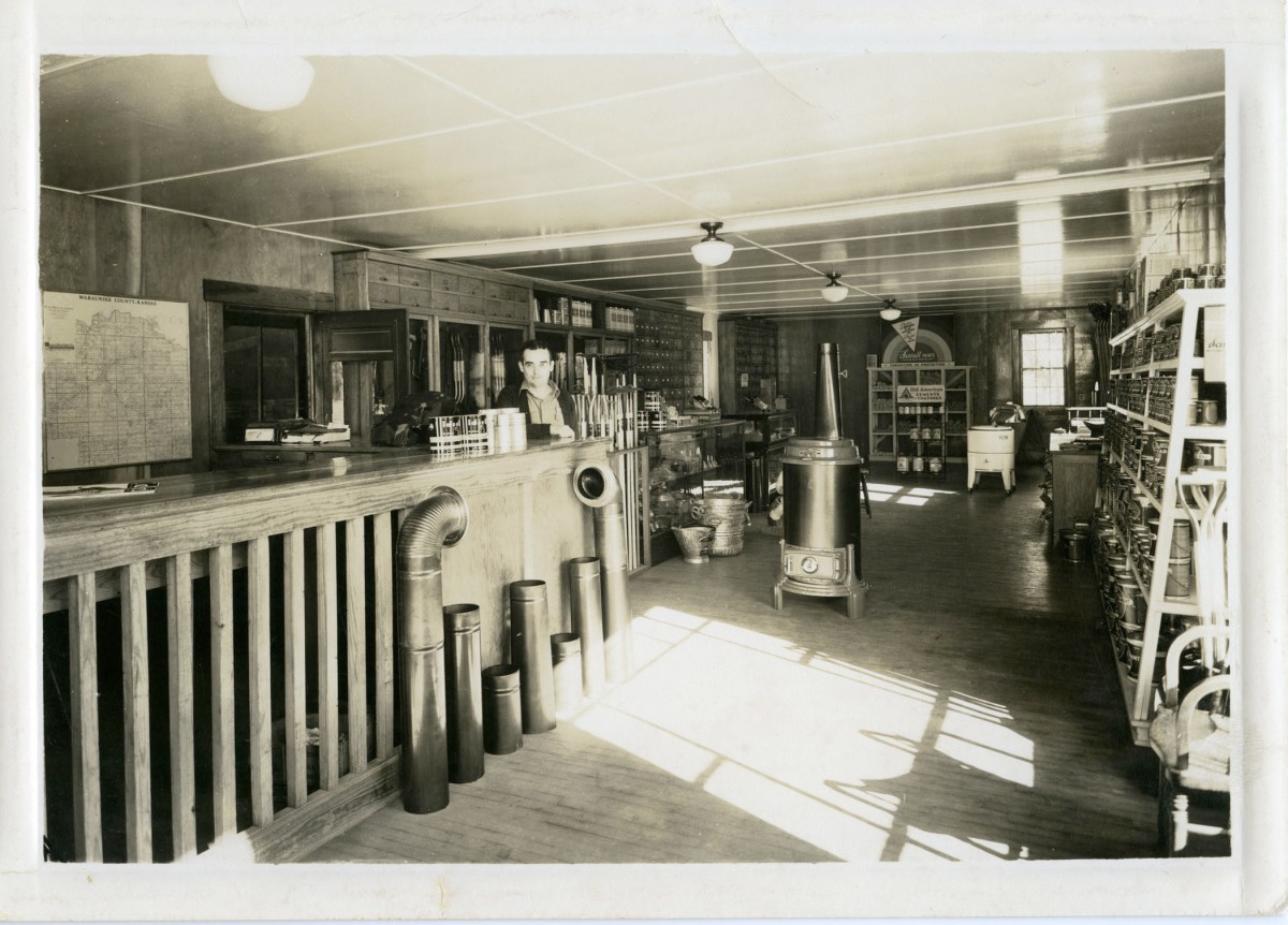 Leland Lucky, manager of the Clinton Scott Lumber Company stands at the counter in this 1930s view of the lumber company before the addition was added to the east.