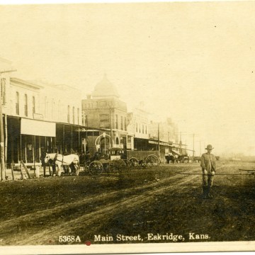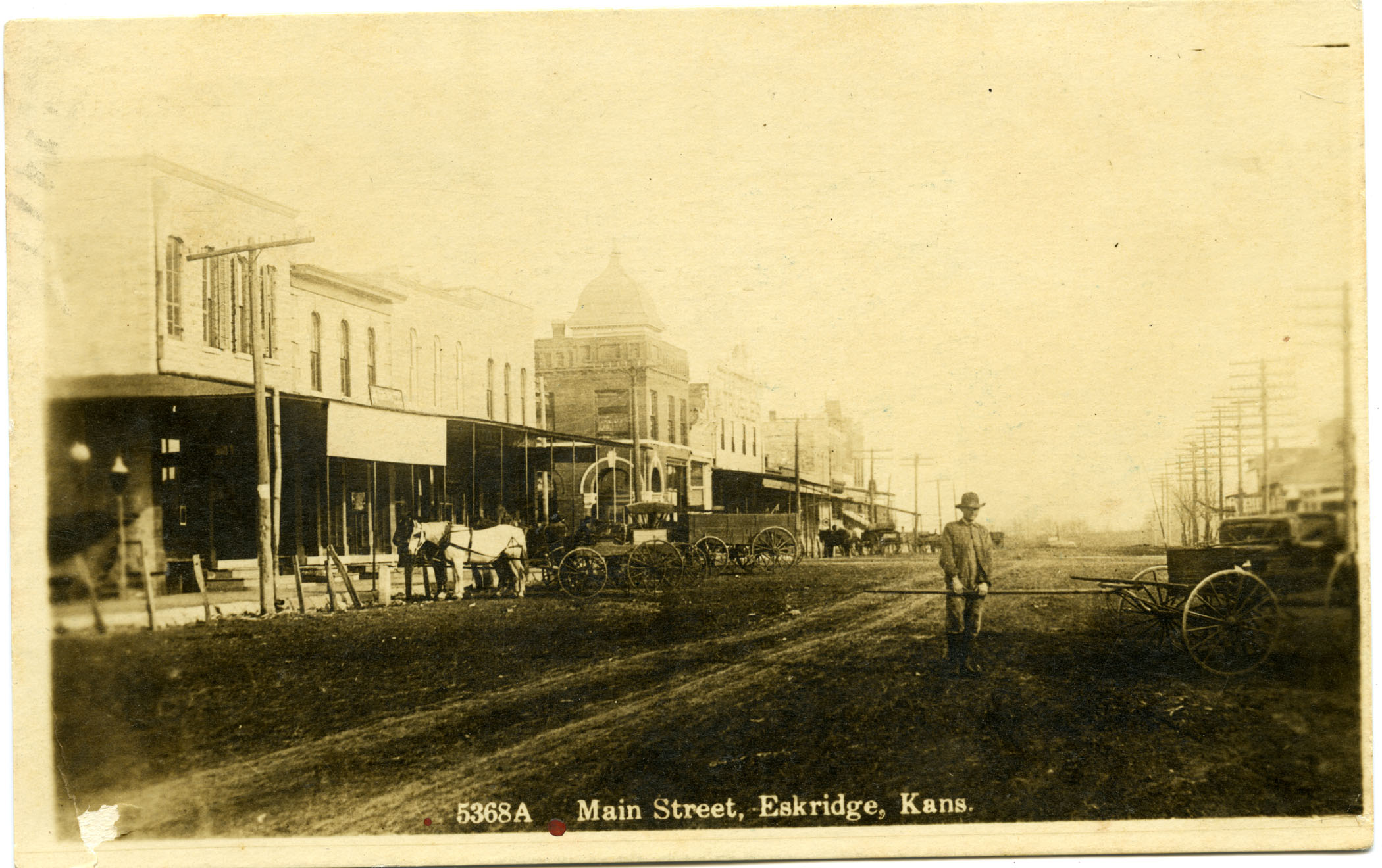 This view of Main Street in Eskridge, Kansas looks to the north from the 200 block in this Zercher Photo view from about 1907.