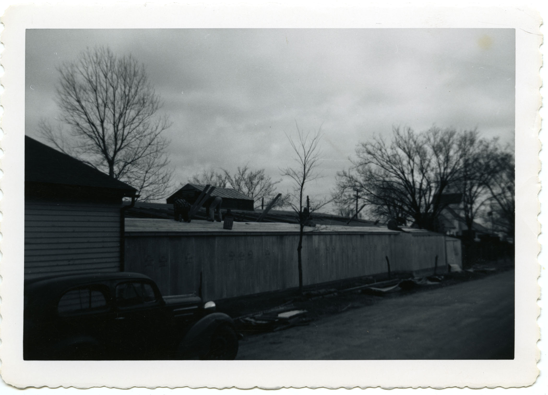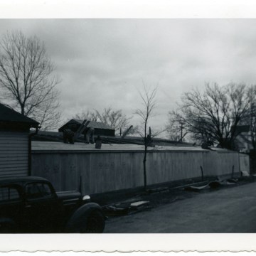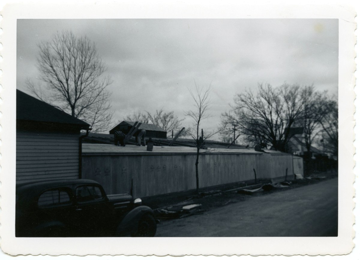 Workers place a metal roof on a lumber storage building at the Scott Lumber Company in Eskridge.