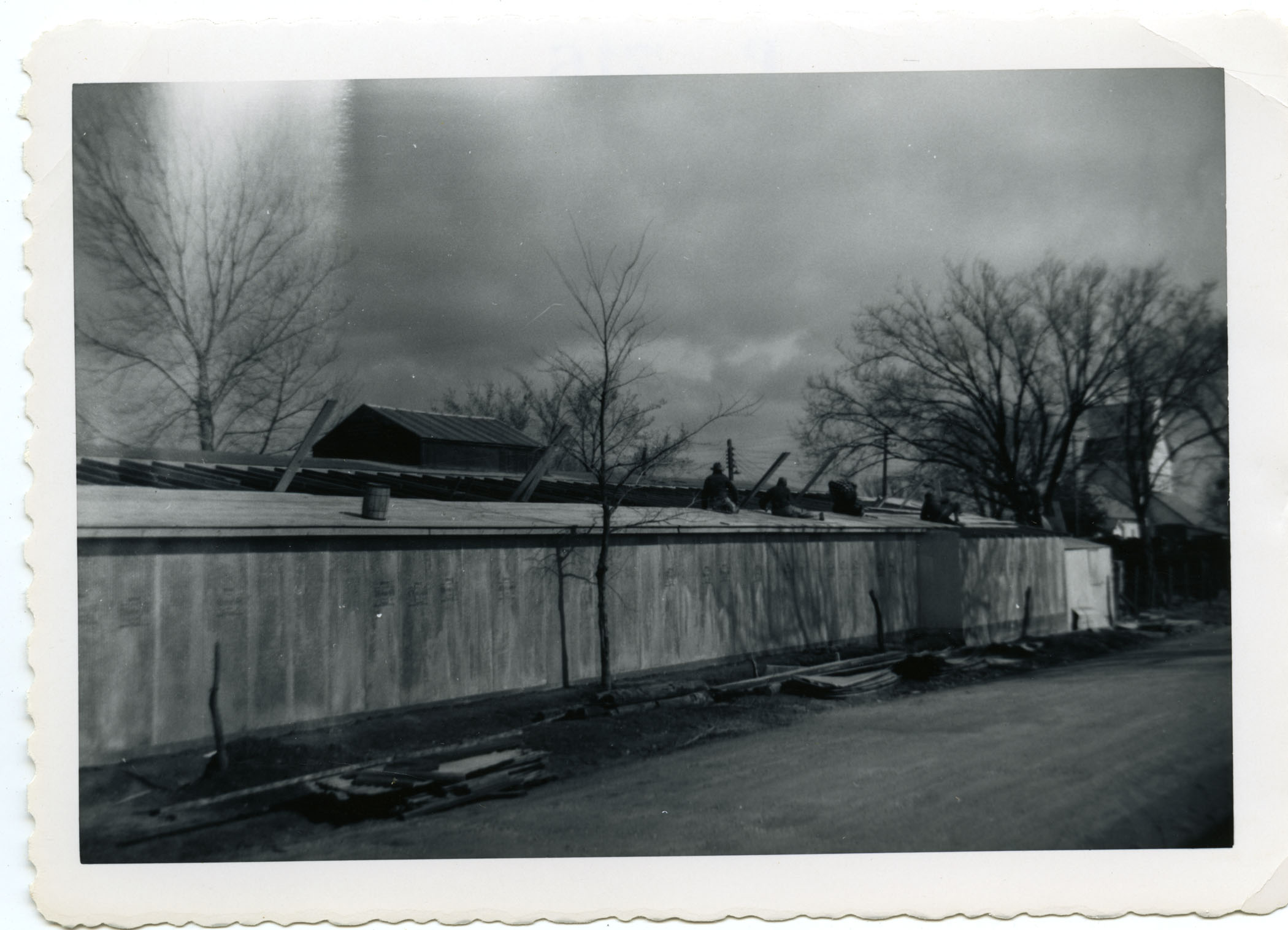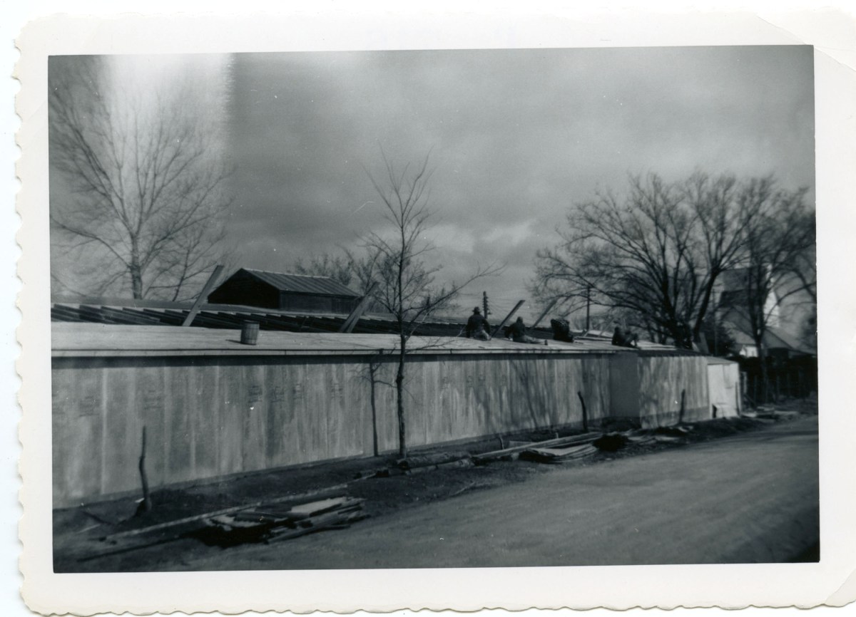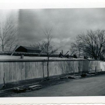 Workers place a metal roof on a lumber storage building at the Scott Lumber Company at Eskridge, Kansas.