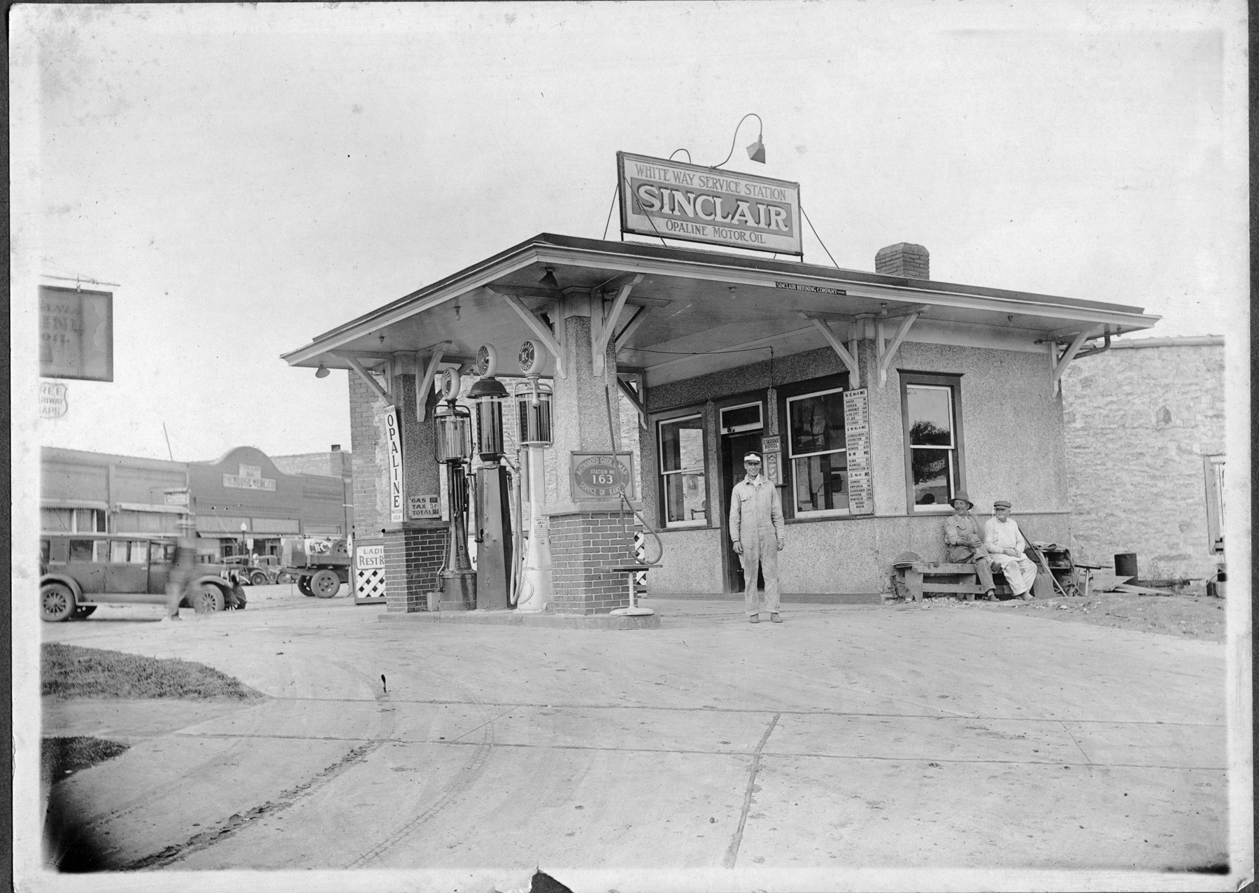 Cloice Meeker stands in front of his Sinclair station located at 122 S. Main Street in Eskridge, Kansas in this view, circa 1925.