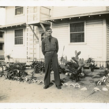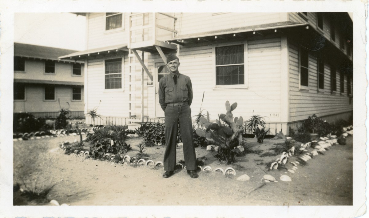 Carl Hoots stands at the barracks buildings at Ft. Ord, California, 1942.