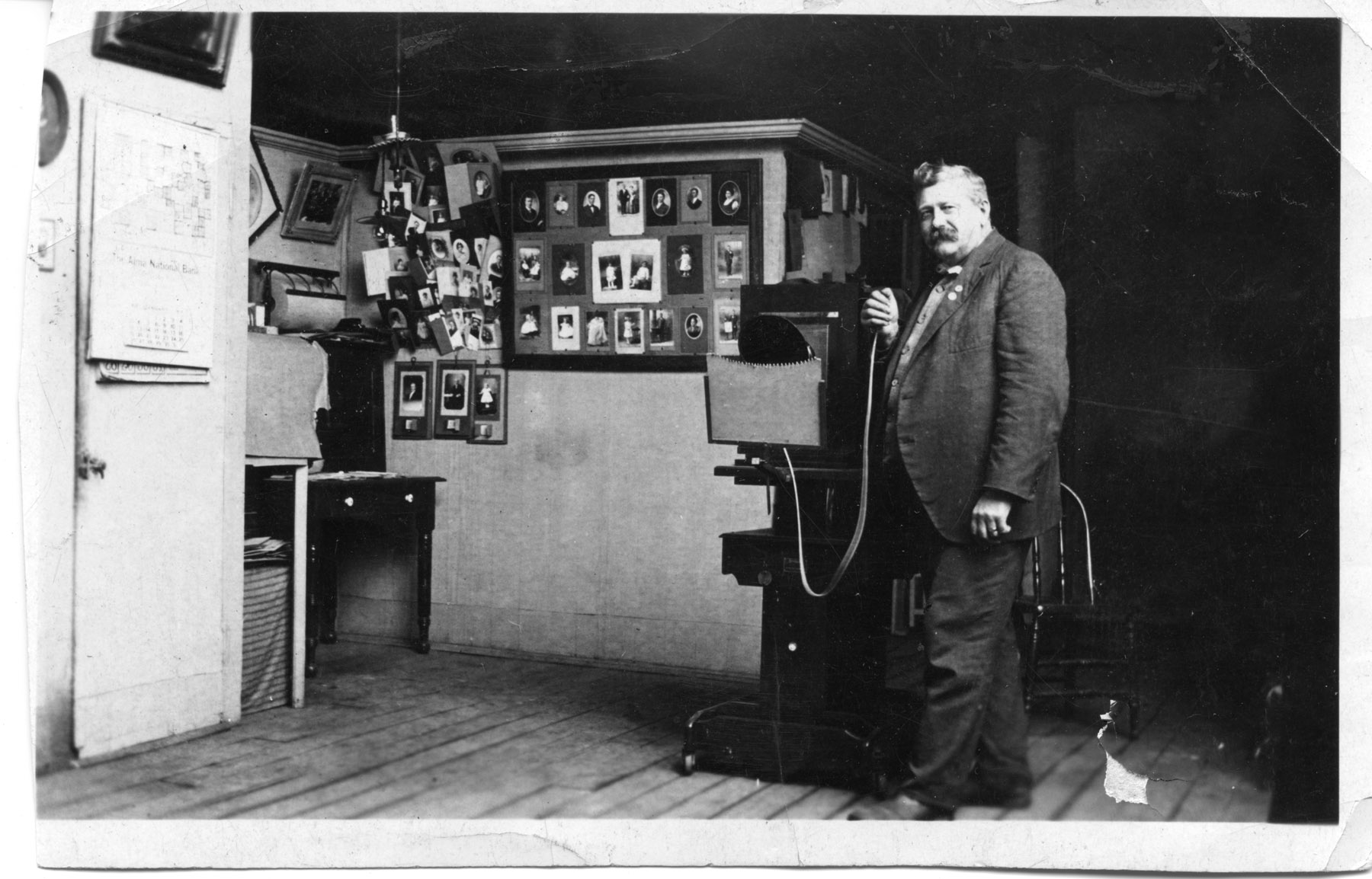 Gus Meier is photographed with a camera in his studio located at 210 Missouri Street in Alma, Kansas.