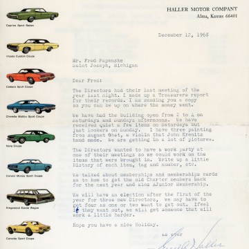 This letter from Alma, Kansas Chevrolet dealer, Gerald Haller to Michigan businessman Fred Palenske, dated December 12, 1968 summarizes the final meeting of the calendar year. Haller served as the first Treasurer of the Wabaunsee County Historical Society.