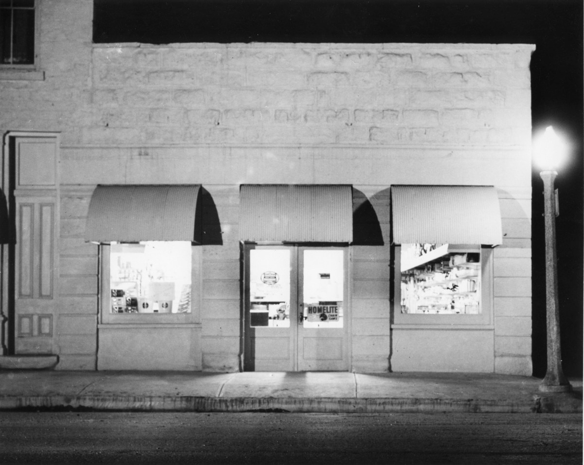 This night view of Hendricks Hardware in Alma, Kansas was taken in the mid-1950s by Alma photographer Armand Atkinson. Photo courtesy Gwen Hendricks