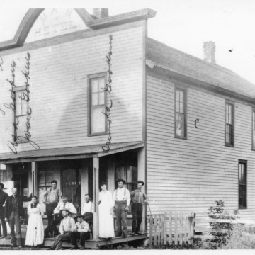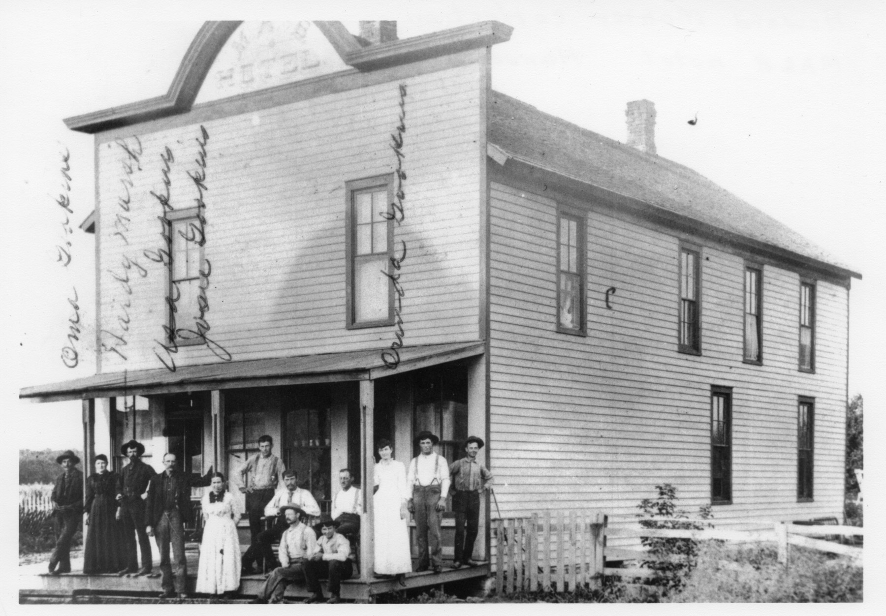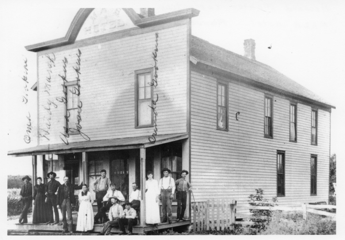 The Manhattan, Alma & Burlingame Hotel was located in Harveyville, Kansas, seen in this view, circa 1890.