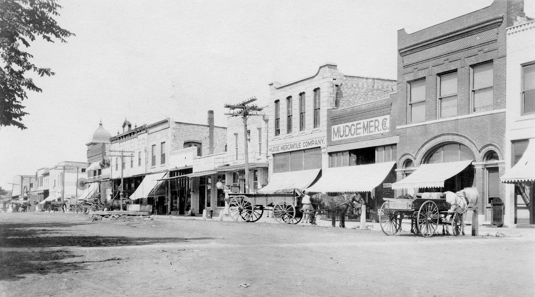 This real photo postcard from about 1908 shows the west side of the 100 block of Main Street in Eskridge, Kansas. The nearest nine buildings in this view were all constructed after an 1890 fire destroyed most of the business district. In 1913 these same nine buildings were destroyed in a second disastrous fire.