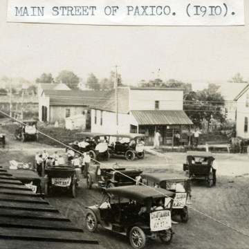 A group of cars advertising a Chautauqua event stops at the intersection of Main and Newbury Streets in Paxico in this real photo postcard view from 1910. Car caravans were a popular method of promoting local events in the early 20th century. Chautauqua meetings were popular meetings providing educational, religious and social programs.