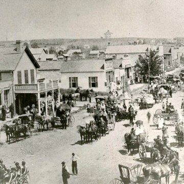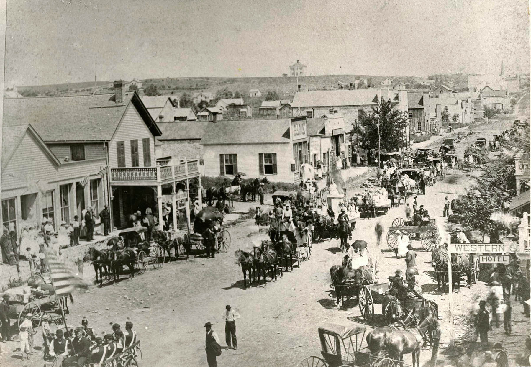 This Louis Palenske photograph of a parade on Missouri Street was taken from the roof of the Palenske Block, located at 204-210 Missouri, looking north. In this view, circa 1886, the first Alma, Kansas courthouse is seen to the left of center, sporting a 2nd story porch and balcony, while just to the north of the courthouse building one sees the Bank of Wabaunsee County. At the far right one can see the sign for the Western Hotel.