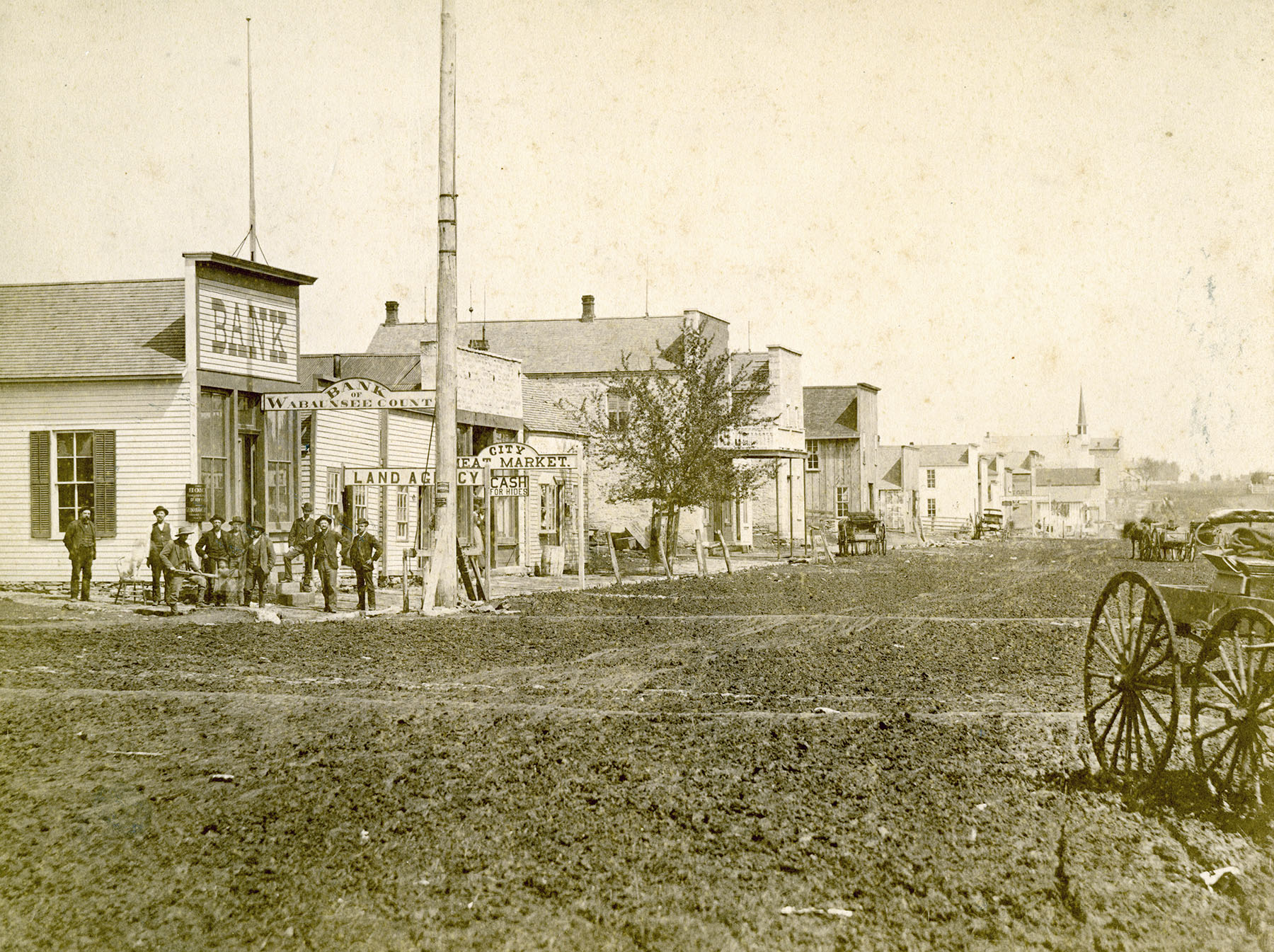 A group of men stand in front of the Bank of Wabaunsee County, located at 301 Missouri Street in Alma, Kansas in this view by Alma photographer, Louis Palenske, circa 1884. To the north of the bank one sees a group of frame and stone buildings, most of which would disappear by 1910. The large pole in front of the bank is a former ship’s mast, and it was later removed for fear that it might fall on a building.