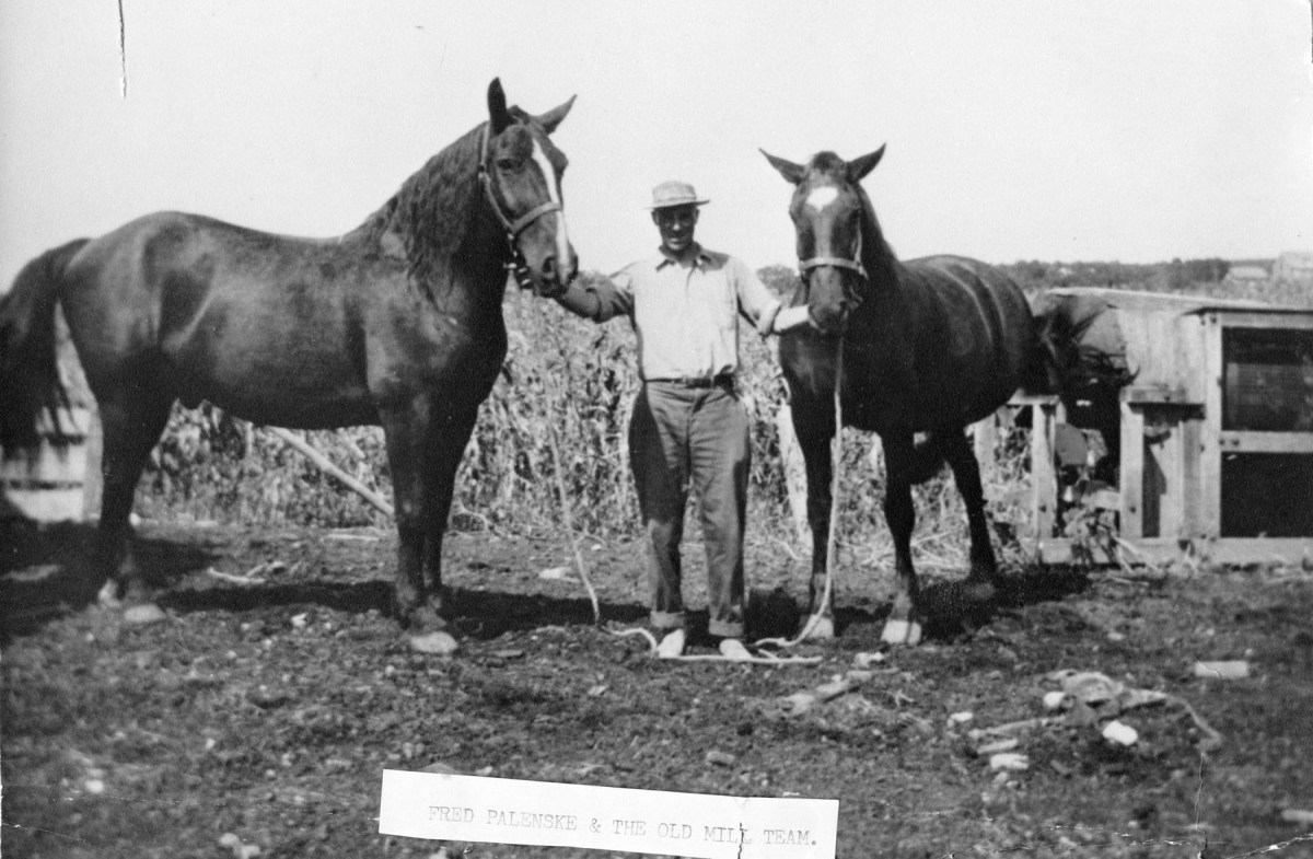 Fred Palenske stands with the “old mill team” at his father’s mill located at Alma, Kansas, circa 1907.