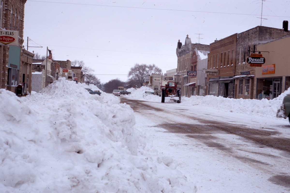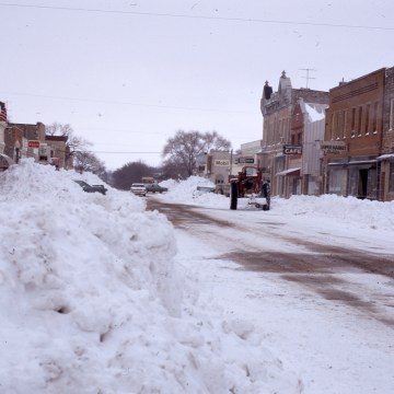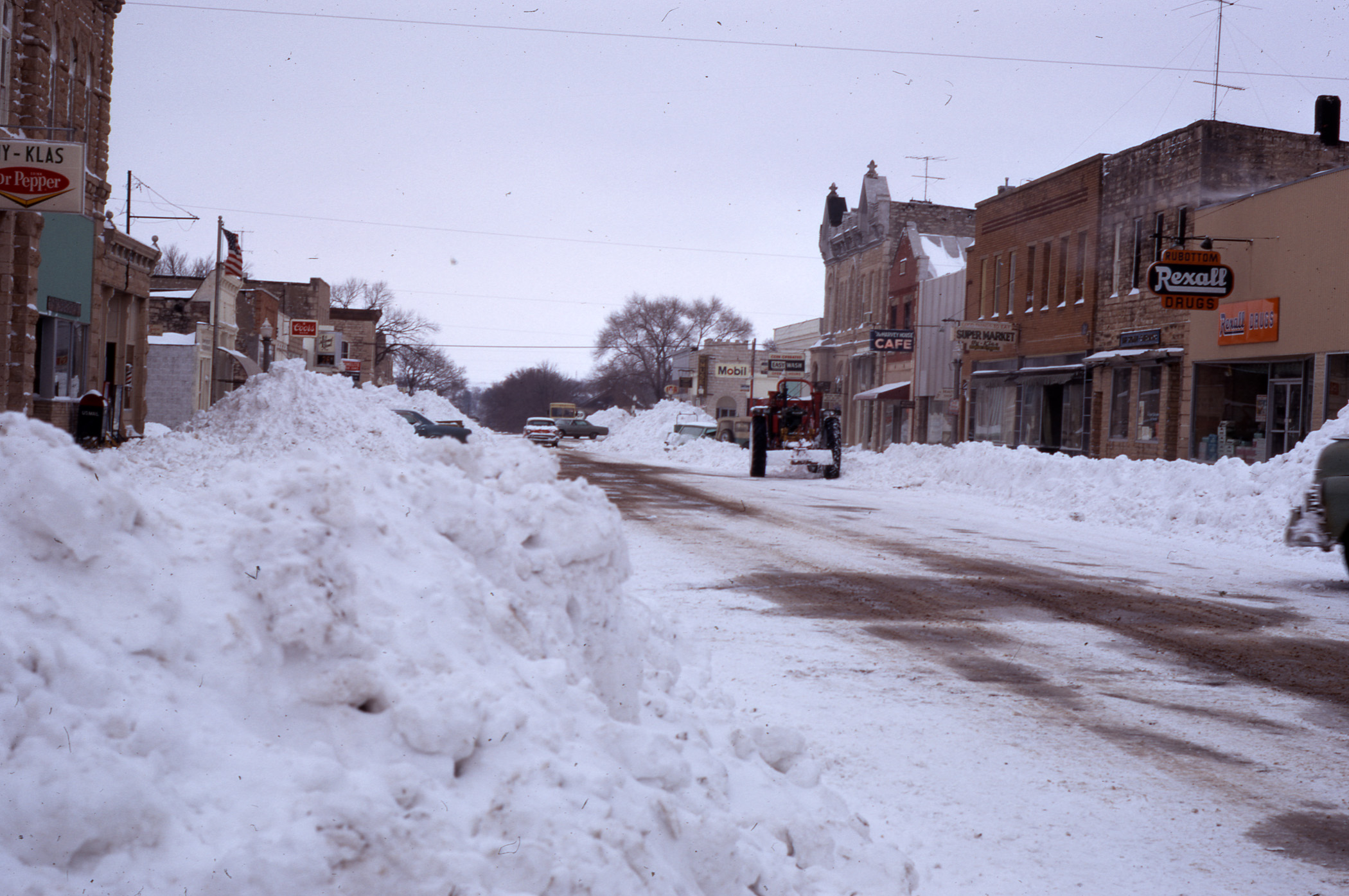 This Charles Herman view of snow removal from Alma’s downtown business district looks to the south from the Alma Hotel.