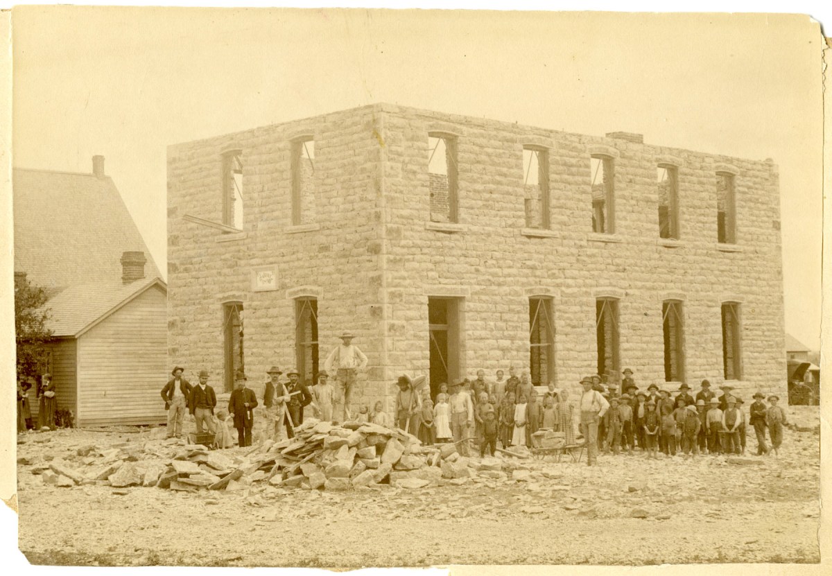 August Zeckser and his crew constructed the St. John Lutheran School in the summer of 1890 and are seen here with a group of onlookers. The masonry work for the new building cost $895.60. Photo Courtesy St. John Lutheran Church.